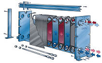 The plate heat exchanger consists of a pack of corrugated metal plates with portholes for the passage of the two fluids between which heat transfer will take place. the plate pack is assembled between a fix frame plate and a movable pressure plate and compressed by tightening bolts. the plates are fitted with a gasket which seals the interplate channel and directs the fluids into alternate channels. the number of plates is determined by the flow rate, physical properties of the fluids, pressure drop and temperature pro-gram. the plate corrugations promote fluid turbulence and support the plates against differential pressure. the plate and the pressure plate are suspended from an upper carrying bar and located by a lower guiding bar, both of which are fixed to a support column. Connections are located in the frame plate or, if either or both fluids make more than a single pass within the unit, in the frame and pressure plates. liquid flow rate up to 4 kg/s, depending on media, permitted pressure drop and temperature program.
